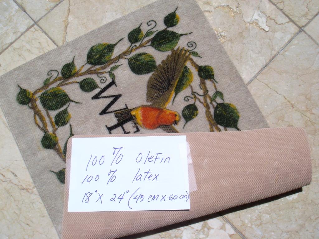 I am looking for a 100% olefin Face or similar material and 100% latex backing rug / doormat measuring 45cm x 60 cm. must be able to print or stencil different art work graphics as in picture attached. Need to know minimum amounts and prices. Need 1,500 pieces weekly at this time with many orders to come. I am looking for a price of < $.80 FOB New York.