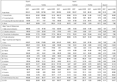 China's I/E of Textile & Apparel by Country & Region (1- 7, 2007)