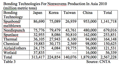 Table 3 shows production volumes for the different bonding technologies used to produce nonwovens in the four top producing countries in 2010.