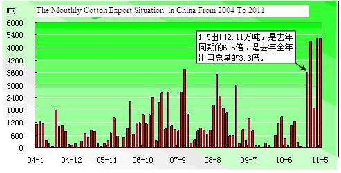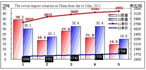 According to the customs, from Jan to May, China imported 1,206,300 tons, which decreased 161,600 tons year on year (-11.8%). China imported 144,600 tons on May, which decreased 27% year on year and deceased 32.3% mouth to mouth, the lowest level in this year. Because the international cotton price is higher than the domestic cotton price obviously, the export volume increased dramatically while the cotton import volume is decreasing. From Jan to May, China exported 21,100 tons cotton, which is 6.5 times compared to the same period of last year and 3.3 times than total export volume of last year. China exported 5,200 tons on May, which is 3.6 times compared to the same period of last year.