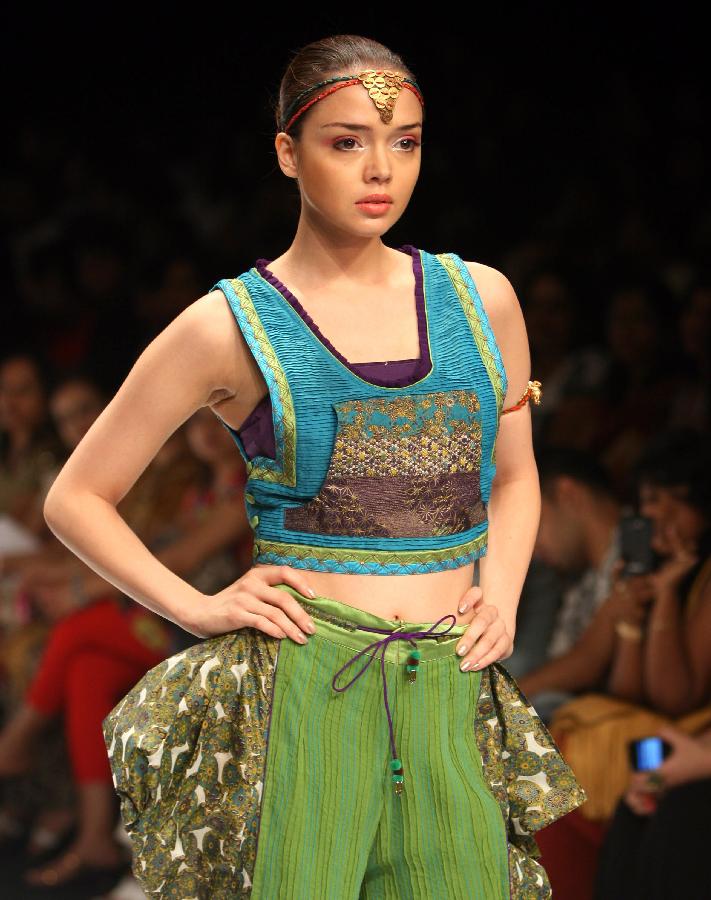 A model displays a creation by designer Pallavi Goenka during the second day of the Lakme Fashion Week in Mumbai, India, on Aug. 18, 2011.