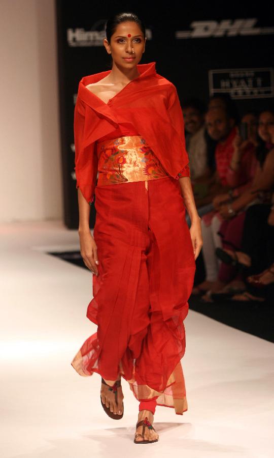 A model displays a creation by designer S Vaishali during the second day of the Lakme Fashion Week in Mumbai, India, on Aug. 18, 2011.