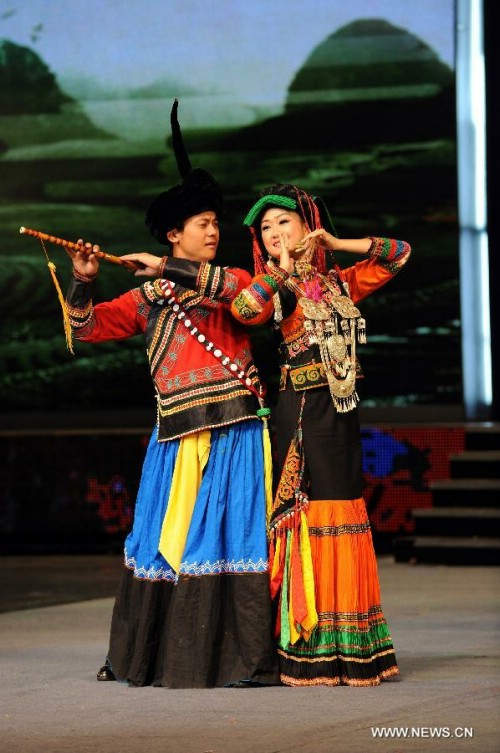 Models present traditional costume of Yi ethnic group during a show of costume of Chinese ethnic minorities in Hohhot City, north China's Inner Mongolia Autonomous Region, Aug. 31, 2011.