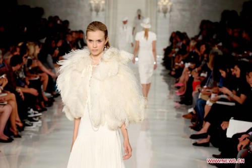 Models present creations at the Ralph Lauren show during the Spring 2012 Mercedes-Benz Fashion Week in New York, the United States, on Sept. 15, 2011.