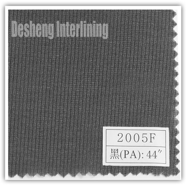 Tricot weft Interlining (knitted fusible interlining) Art No: 2005F/ 2375F/ 2015F/ 2008F Width(inch): 44/ 60 Weight: (gsm): 40 Base Cloth: 100% polyester Coating: PA Coating Type: single dot; double dot Color: off white, white, black, gray, deep gray Application: fashion, jacket Supply Ability: 2Million meters/month Minimum Order: 50000M Delivery Lead Time: 25-30days