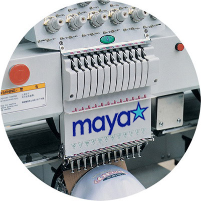MAYA computerized cap embroidery machines Suitable for flat embroidery, Garment embroidery and cap embroidery (1-12 heads),  Color LCD display with Design storage capacity, the inner memory can store 99 designs and the total stitches are over 240,000 stitches.  Due to thread broken during embroidering, some embroidery fail to work and the needle should return to the place where embroidery fails and begin darning The number of returnable stitches is not limited and it can return to the original point of present normal design in embroidering combined design.  Design can be rotated by 1degree step within 360 degree and reverse from left to right .It also can be magnified or minified by different ratio in horizontal or vertical direction Besides it can meet different requirements by selecting rotation priority or pantograph priority.  The pattern periphery and center cross line can be embroidered, and with No.99 linear pattern. It is very convenient to position using these methods. MAYA series cap embroidery machine Model Head Head interval Needle Emb.space(mm) Machine size (LXW) (mm) CT-901 1 400mm 9 400 X 450 1000 X 800 CT-902 2 400mm 9 400 X 450 1520 X 870 CT-904 4 400mm 9 400 X 450 2640 X 920 CT-906 6 400mm 9 400 X 450 3430 X 920 CT-908 8 400mm 9 400 X 450 4230 X 920 CT-912 12 400mm 9 400 X 450 6920 X 1400 CT-1201 1 400mm 12 400 X 450 1000 X 800 CT-1202 2 400mm 12 400 X 450 1520 X 870 CT-1204 4 400mm 12 400 X 450 2640 X 920 CT-1206 6 400mm 12 400 X 450 3430 X 920 CT-1208 8 400mm 12 400 X 450 4230 X 920 CT-1210 10 400mm 12 400 X 450 6120 X 1400 CT-1212 12 400mm 12 400 X 450 6920 X 1400