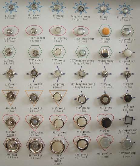 SNAP BUTTON---OUR STRONG ITEM FOR SANP BUTTON. MATERIAL HAS BRASS AND STAINLESS STEEL. THE SIZE FROM 111# TO 555# AND 888#. AND NICKEL FREE. WE CAN DO CAP & SQUARE & PEARL & DIAMOND CAP FOR YOU. STAINLESS STEEL MATERIAL IS OUR NEW LINE, WE ARE 1ST IN CHINA, WHO USE THE STAINLESS STEEL TO DO SNAP BUTTON. HOPE OUR GOODS CAN MAKE YOUR SATISFIED. KINDLY SHARE A LITTLE TIME TO REVIEW OUR WEBSITE.