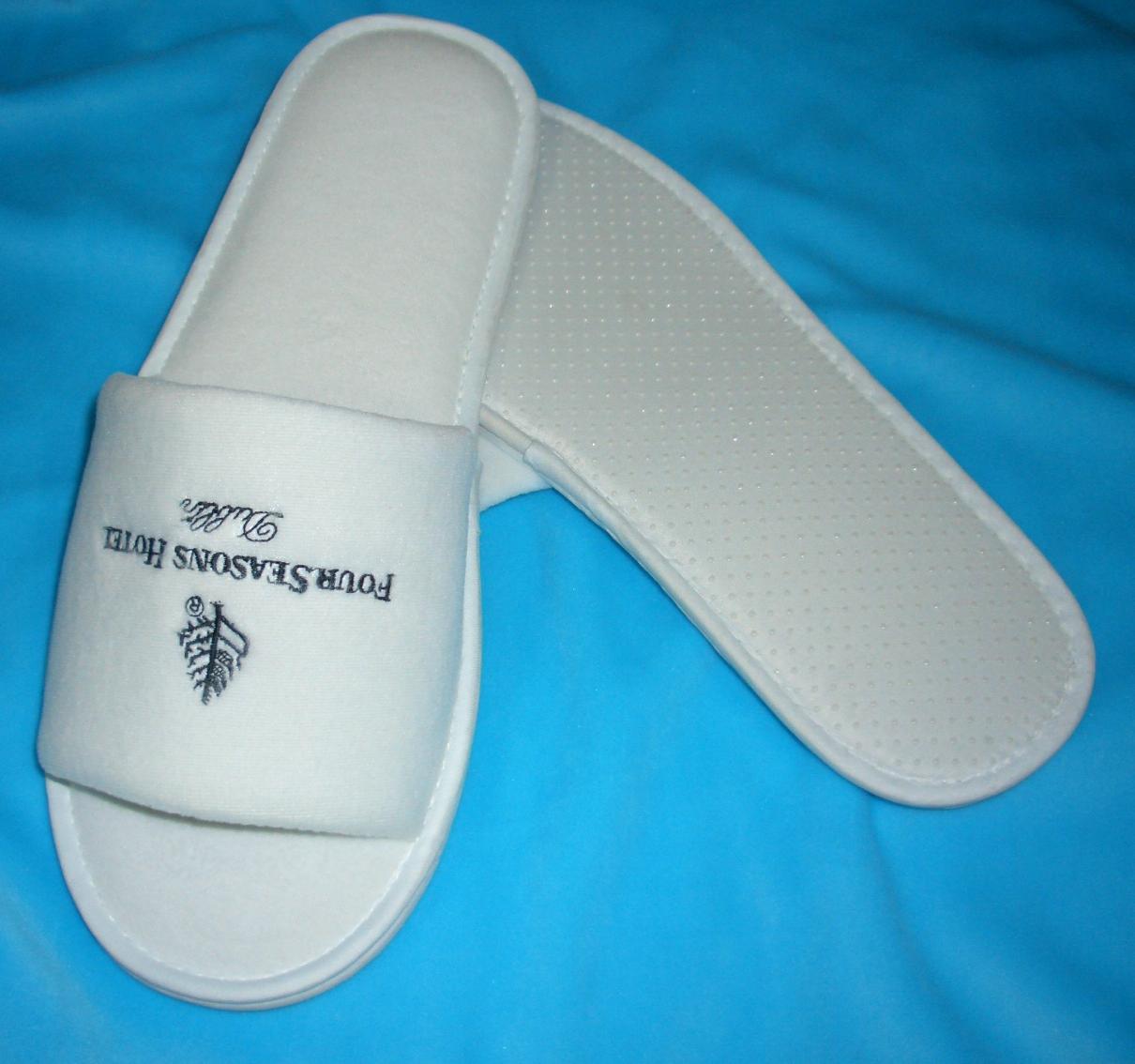 white velour fabric , 29cm length, open front,embroidary logo on vamp,dotted pvc cloth sole,thickness sponge, soft and comforable to wear;customized design and size is available. For detailed information please contact me.