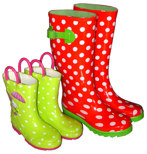 Made from natural rubber, cotton knitting lining (kid boots with white lining and lady boots with green lining), molded outsole. Children boots size range: 24/25, 26/27 Lady boots size range: 37/38, 39/40 The two kind of wellies are a whole set, but they could be sold separately. The Unit Price for lady wellies is: $4. 50/pr FOB Shanghai, PE bag. The Unit Price for kid wellies is: $2. 50/pr FOB Shanghai, PE bag. MOQ: 1000prs per style Payment Term: T/T or D/P