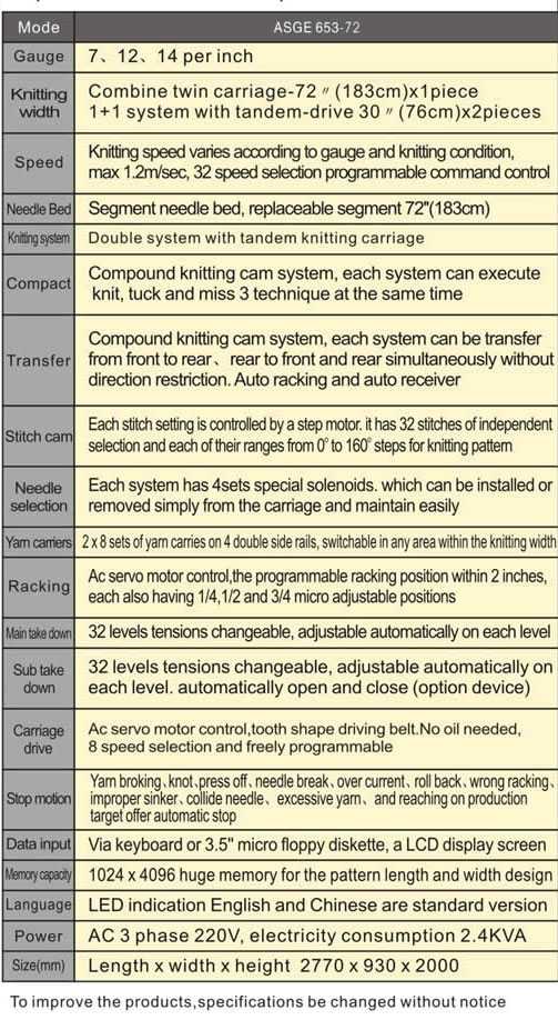 ASGE653 fully computer control flat knitting machine which was opened up in 2004. This product adopt the computer control technique and the original package accessory from Japanese, with lead a position in the fully computer control flat knitting machine field in China, and keep a high technique content and strong adaptability, it is a advanced equipment which is essential to have in the producing of medium and upscale woolen sweater, with a good market foreground. It has passed the new product appraise of Suzhou science office in 2005.