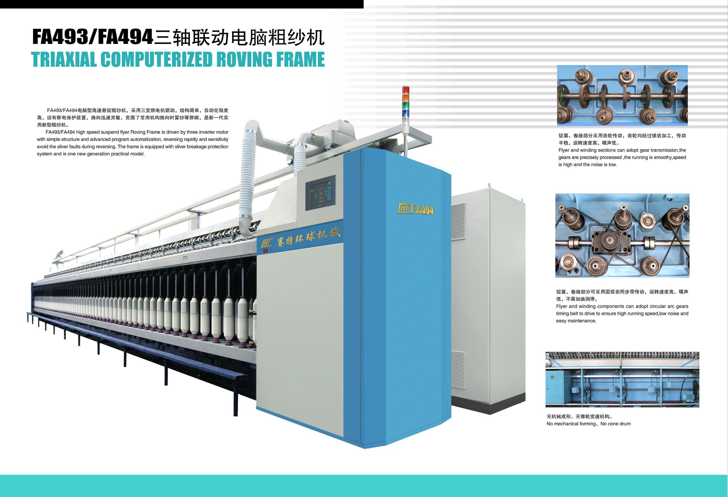 Flyer and winding sections can adopt gear transmission,the gears are precisely processed,the running is smoothy ,speed is high and the noise is low.