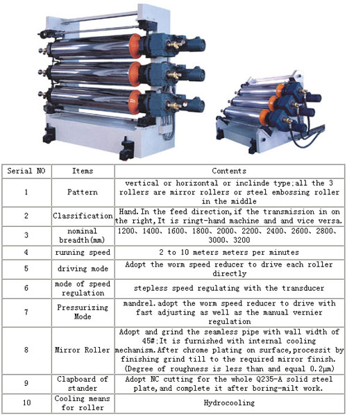 The product can be used to produce plates of ABS,PS,PP,PE,PMMA,PC single and multilayer obsorbing moulding,building materials,decoration and mitigate corrosion.The plates produced by the calender can be widely used in the fields of the docoration for refrigerators,air-conditioners and automobiles as well as in the fields of advertising,building,environmental protection and chemical,etc.
